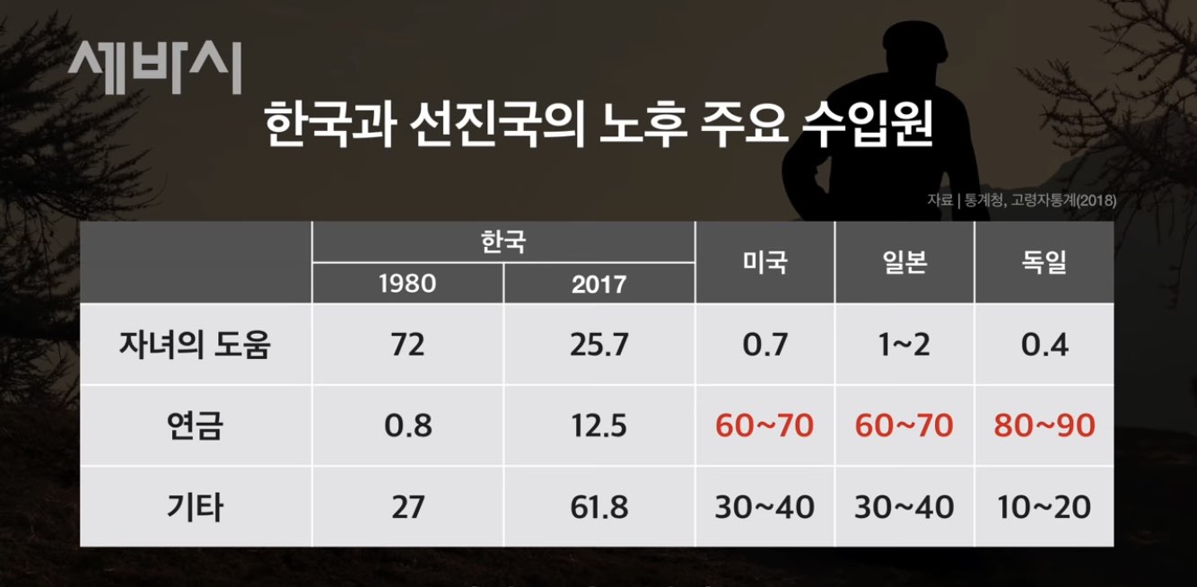 그러면 우리나라 노인분들은 그동안에 뭘 먹고살았을까요? 1980년도에는 72% 자식이 도와줬어요. 그런데 지금은 25%로 줄었어요. 10년쯤 지나서 이 조사를 다시 하면 우리나라도 자녀의 도움을 받는다는 비율이 미국처럼 0.7%, 일본처럼 1.9%, 독일처럼 0.4%가 될 거예요. 선진국 어느 나라도 자식이 부모의 주 생활비를 도와주는 나라가 없거든요. 또 도와줄 수 없는 게 1960년 기준으로 우리나라 여성 어머니들의 평균 수명이 54세였어요. 2018년 기준 어머니들의 평균 수명이 86세입니다. 32년이 늘어났어요. 60년대까지만 해도 수명이 짧았기 때문에 노부모 부양 기간이 평균 5년밖에 안됬거든요. 그런데 앞으로 백세시대에는 25년에서 30년입니다. 이제는 노인이 노인을 부양해야 되는 시대예요. 자식도 노인인데 나를 어떻게 도와줍니까?