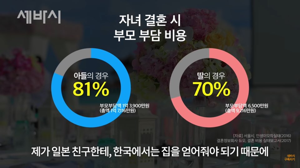 결혼을 할 때도 우리는 자녀에서 주택 마련에 도움을 줘야 합니다. 일본은 신행여행 갈 때 용돈 정도만 챙겨줍니다. 그런데 우리나라는 부모가 못해줘서 더 난리입니다. 우리나라의 젊은 남녀가 자기의 돈으로 결혼하는 비율이 10%밖에 안돼요.