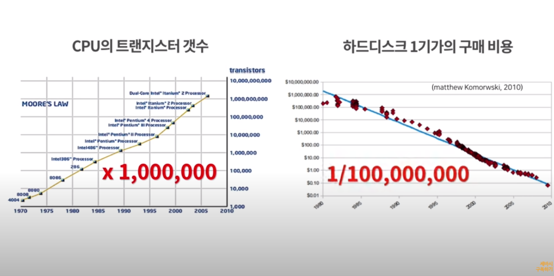 인류나 문명뿐만 아니라 개인의 삶에 있어서도 변곡점이 있다고 생각합니다. 저는 대학교 때 첫 인공지능 회사를 설립했습니다. 많은 분들이 묻습니다. 도대체 어떻게 26년 전에 인공지능 회사를 설립했냐고. 사람한테는 무언가에 큰 변화가 있을 때 동기와 용기가 필요하잖아요. 저한테도 동기가 있었습니다. 태어 나서 처음으로 사랑하는 여자 친구를 만났어요. 데이트를 하고 싶은데 돈이 필요해서 회사를 차렸습니다. 그리고 그 회사가 생각보다 꽤 잘됐고 제 인생에서도 큰 변화를 만들어 내게 됐죠. 이러한 변화와 동기는 개인뿐만 아니라 산업과 사회 전체를 바꾸는 동력이 되기도 합니다. 밑에 그림의 왼쪽에 있는 그래프는 지난 30년간 컴퓨터 CPU의 트랜지스터의 개수가 백만 배 증가되었습니다. 오른쪽 그래프는 하드디스크 1기가를 구매하는데 드는 비용입니다. 지난 30년 동안의 가격이 1억 분의 1로 떨어졌습니다. 이렇게 큰 기술의 발전은 또 다른 변화를 만들어 내고 변화 혁신에 대한 동기를 부여하게 됩니다.