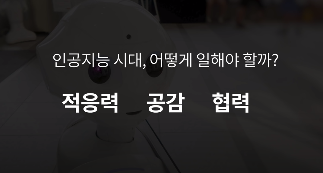 미래는 일하는 방식이 바뀔 겁니다. 과거에는 큰 물고기가 작은 물고기를 잡아먹습니다. 대기업이 작은 기업을, 돈 많은 사람이 돈 적은 사람을. 그렇지만 4차 산업혁명을 살고 있는 우리 시대에는 빠른 물고기가 늘인 물고기를 잡아먹고, 친구 많은 물고기가 친구 없는 물고기를 잡아먹는다고 저는 믿습니다. 그럼 우리가 어떻게 일하고 빠른 변화에 적응할까요? 인공지능은 한 번도 안 본 것은 대응을 할 수가 없어요. 데이터로부터 있는 결과만 학습하고 상상력이 없으니깐요. 그리고 공감을 할 줄 알아야 합니다. 공감능력 핵심은 내가 경험하지 않았지만 상대방의 아픔과 상대방의 기쁨을 공유할 수 있는 그런 감정이죠. 마지막은 협력을 통해 결과물을 만들어 낼 수 있는 능력이 중요할 거라 믿습니다.