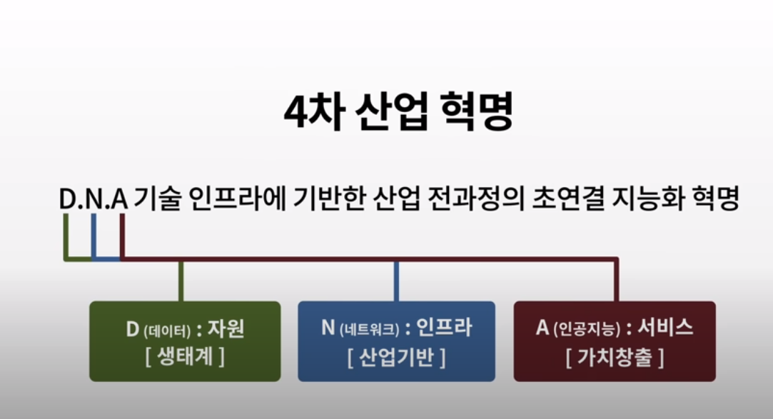 우리는 4차 산업혁명을 맞이하고 있습니다. 4차 산업혁명은 지적인 자동화를 가져온다고 우리가 얘기를 합니다. D.N.A라는 새로운 기술에 기반한 초연결하는 세상 이걸 통해서 혁신이 일어난다고 봅니다. 첫 번째 D는 데이터를 의미합니다. 데이터는 새로운 자원 새로운 생태계를 만들어냅니다. 그다음 N은 5G 네트워크가 되겠고요. A는 인공지능인데 인공지능은 기존에 존재하지 않았던 새로운 서비스와 가치 창출을 만들어내는 겁니다. 과거에 우리는 근육을 증가하는 시대에 살고 있었습니다. 여러분은 혹시 최근에 자동차와 달리기 시합을 한 적이 있나요? 자동차는 우리의 다리의 근육을 증강하는 역할을 합니다. 공사장의 포클레인은 우리의 팔의 근육을 증강하는 역할을 합니다. 인공지능은 어떨까요? 지적인 노동을 자동화하는 거겠죠. 인공지능의 미래가 혹시 사람의 일자리를 빼앗고 우리 대신 일을 하는 상상을 하셨나요? 저는 그렇게 생각하지 않습니다. 적어도 제가 살아있고 제가 사랑하는 아이들이 살아있는 동안에는 기계와 사람이 협력하는 세상이라고 저는 확신을 가지고 있습니다.