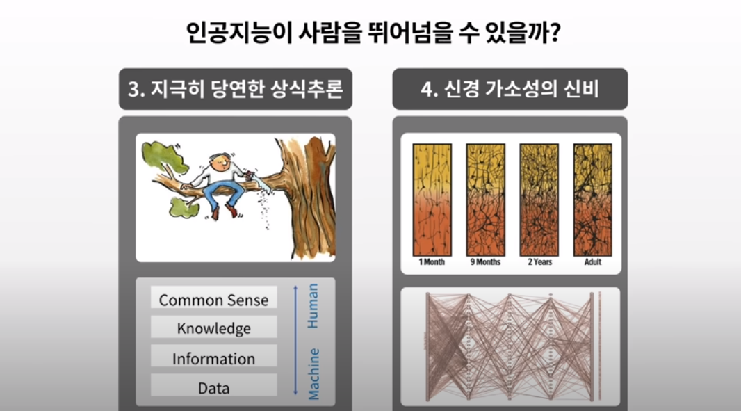 3번째는 상식입니다. 우리한테는 너무나 당연한 것을 기계에게 가르쳐주기가 가장 어렵습니다. 데이터와 정보, 지식은 다 가능하겠지만 상식은 가르쳐줄 방법을 우리가 알지를 못해요. 우리가 뻔히 아는 것을 기계는 어떻게 배워야 되는지도 알지 못합니다. 인간한테는 가장 유리한 방법인데 기계한테는 가장 어려운 게 되는 거죠. 4번째는 뇌과학에서 말하는 신경 가소성이라고 하는데요. 뇌가 끊임없이 활동을 하면서 새로운 회로를 만들어내는 이론이고 실제로 우리 뇌는 그렇게 작동됩니다. 하지만 현재 인공지능은 한번 회로를 만들어 놓고 그 회로 간의 연결 강도만 학습하지 새로운 회로를 만들어낼 방법이 없어요. 인간은 태어나서 한 달 됐을 때는 회로가 없습니다. 그러다가 10살에서 13살이 되면 인생에서 가장 복잡하고 많은 회로를 갖게 됩니다. 바로 사춘기입니다. 그 시기를 지난 다음 회로가 단순해지기 시작합니다. 오히려 제 나이가 되면 12살 때 신경 회로의 회로 개수는 절반으로 줄어듭니다. 대신 고속도로가 뚫리게 되는 거죠. 습관, 선입관이 생기게 됩니다. 그럼에도 불구하고 저는 죽기 전까지 끊임없이 제 뇌세포는 새롭게 연결되고 강도가 학습이 되면서 새로운 걸 배워가는데 현재 인공지능은 방법을 모릅니다.